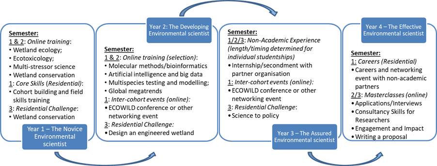 The ECOWILD CDT delivers a training programme designed to support and guide students on their journey from novice researcher to becoming an effective and influential environmental specialist. Students will gain the skills and expertise required to undertake high quality interdisciplinary research necessary to solve real world challenges associated with understanding and managing the impacts of multiple stressors on wetlands.